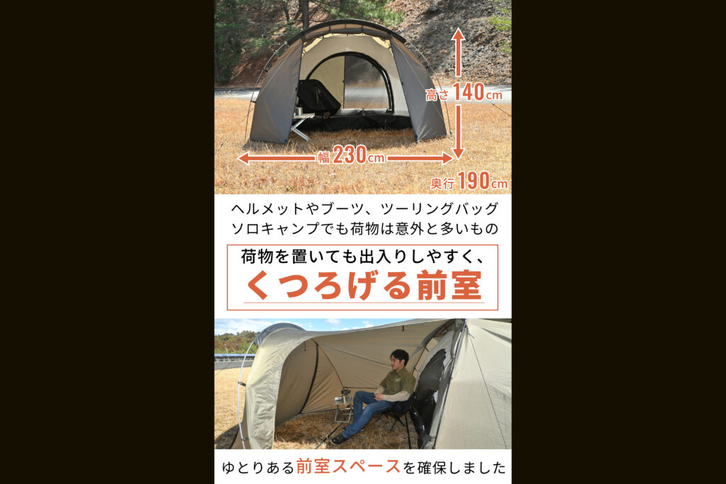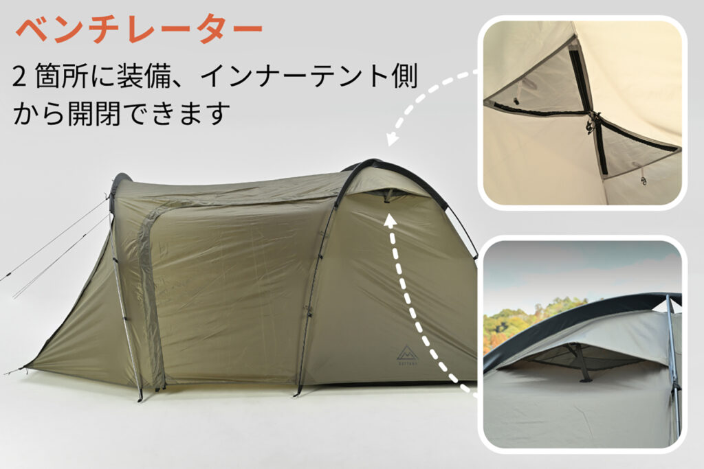 またインナーテント内部から開閉可能なベンチレーターを採用。シュラフから出ることなく温度調整ができるため、夜間の急な冷え込みにも即座に対応可能。入り口のトグルにはアジャスターが備わり、グローブを装着したまま片手で操作できる点も大きなメリット。ライディングウェアを着用した状態での撤収作業など、ライダー特有の環境を考慮した設計といえます。その他にも3箇所のランタンフックや3方向の出入口など、快適な滞在を支える装備を網羅しています。