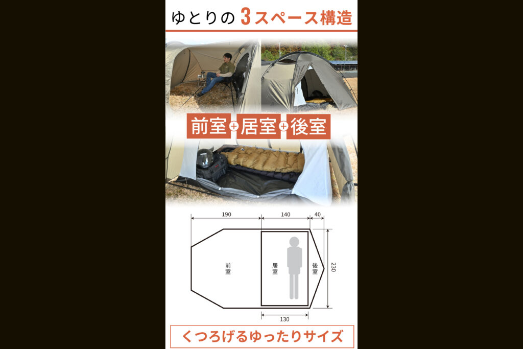 最大の特徴は前室のキャノピー仕様にあります。別売りのポールで跳ね上げることで、日差しや雨を遮る居住空間を創出。タープを持参せずとも、雨天時の調理や荷物整理を快適におこなえます。