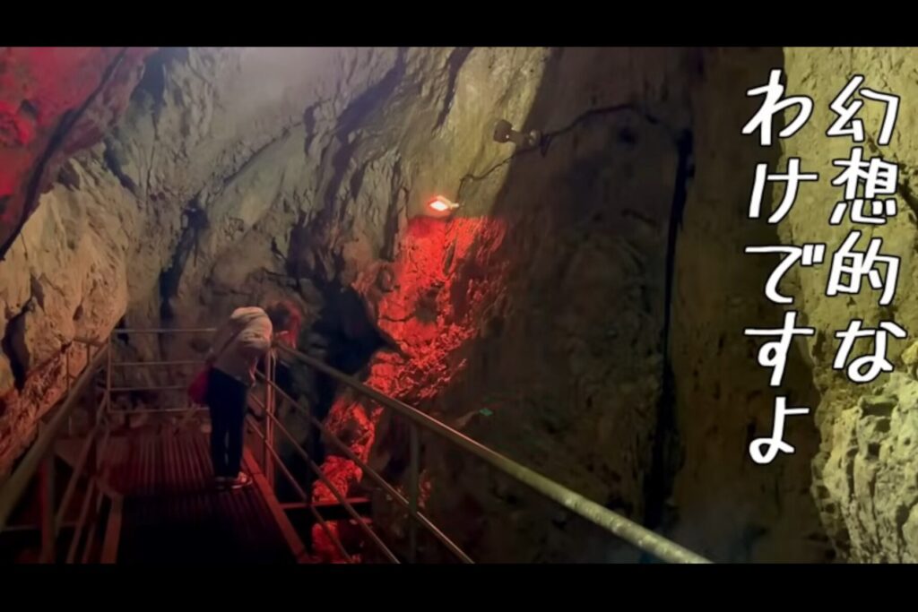 鍾乳洞は入口にある機械へ100円を入れると20分間ライトアップされる仕組み。赤や緑、紫など色とりどりの光に照らされた洞内は、まるで異世界のような幻想的な空間です。コウモリの姿も見られ、自然の神秘を間近に感じたゆみごんさんでした。