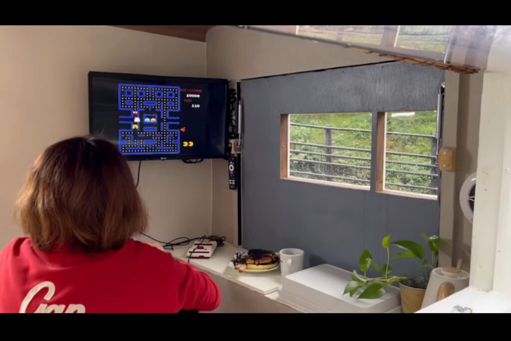 食事を楽しみつつ、お気に入りのレトロゲームでのんびりとした時間を過ごすゆみごんさん。雨音と緑に包まれた空間で、1時間ほどの仮眠もとりました。まさに“自分だけの贅沢な時間”ですね。