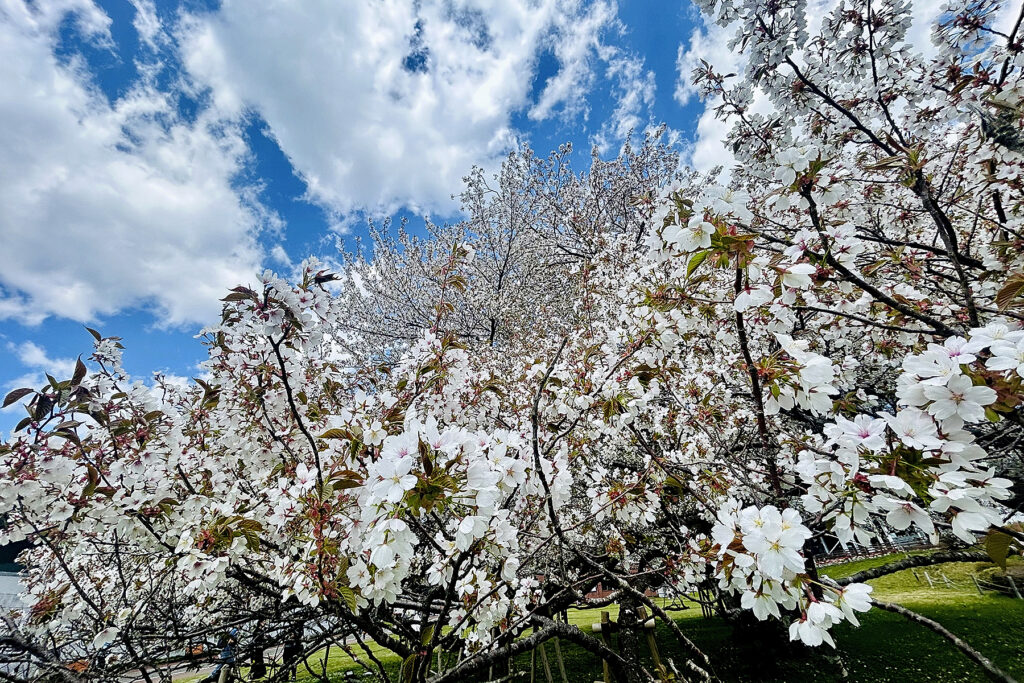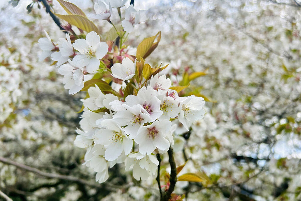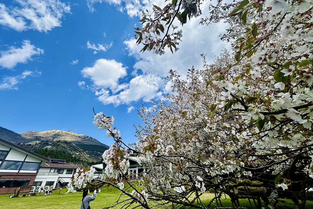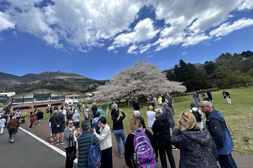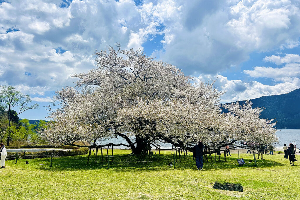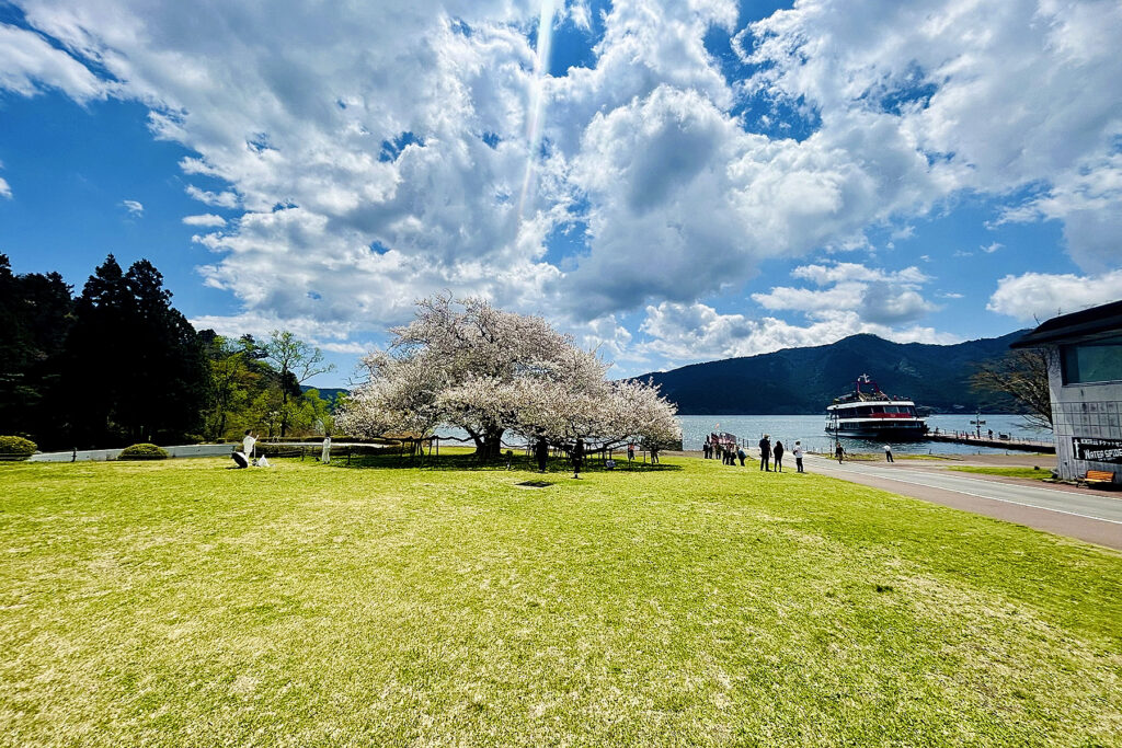 箱根、芦ノ湖のほとりに位置する箱根園。ここで樹齢110年を超え、富士山を彷彿とさせる樹容を誇る「湖畔の一本桜(オオシマザクラ)」が、前年より約一週間早く満開を記録しました。遊覧船から降り立つ欧米インバウンド客の賑わいに圧倒されつつも、春の澄み渡る青空の下、白妙に輝く大樹を鑑賞。まさに圧巻の情景です。