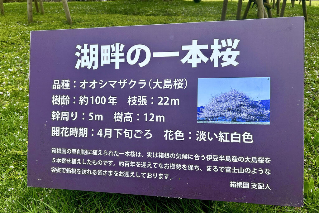 箱根園の一本桜は二つの異なる借景を一度に享受できる稀有な存在です。箱根駒ヶ岳を仰げば峻険な山容に際立つ優美な立ち姿を、芦ノ湖を背にすれば枝張り22メートルに及ぶ富士山型の円錐形を堪能。この「二面の美」こそ、本樹が唯一無二とされる所以です。