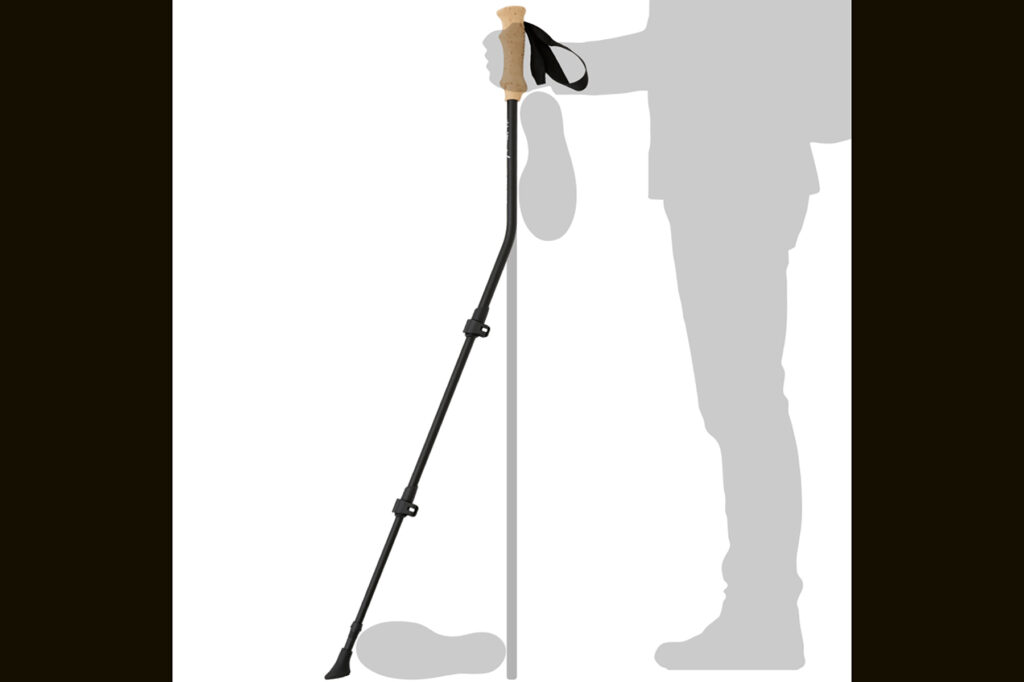 一般的なトレッキングポールがまっすぐな形状であるのに対し、この製品はグリップから約25cm下の位置で前方に曲がる「くの字型」を採用。この形状がなぜ生まれ、どんな効果をもたらすのか——その背景には、ヤマップが掲げるひとつの問いがあります。