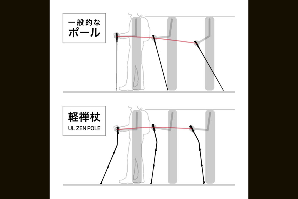 一般的なトレッキングポールは杖先が身体の近くに接地するため、身体を支える土台となる面積(支持基底面)が狭くなりがちです。これに対し「軽禅杖」は杖先が一歩前方に接地するため、支持基底面が自然と広がります。接地点が前にある分、重心の移動が安定し、岩場や不整地でもバランスを崩しにくくなるという設計です。