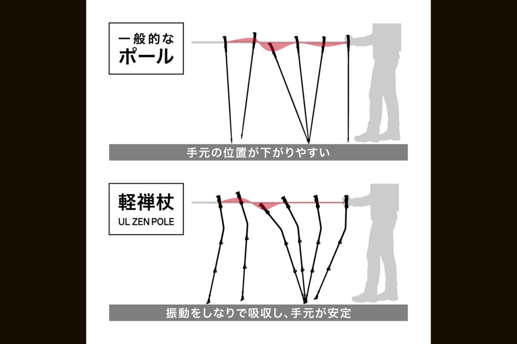 さらに、くの字型のしなり自体が地面を突いた際の振動を吸収する緩衝材としても機能します。衝撃が蓄積しやすい長時間の山行での疲労軽減が期待できる一方、安定性という面でも従来のポールとは異なる効果があります。