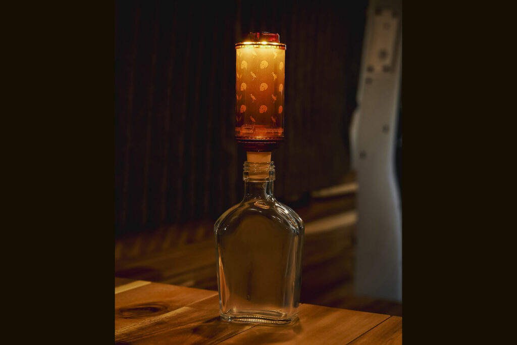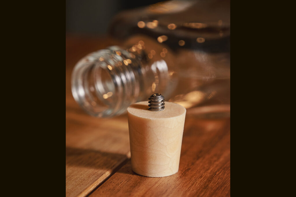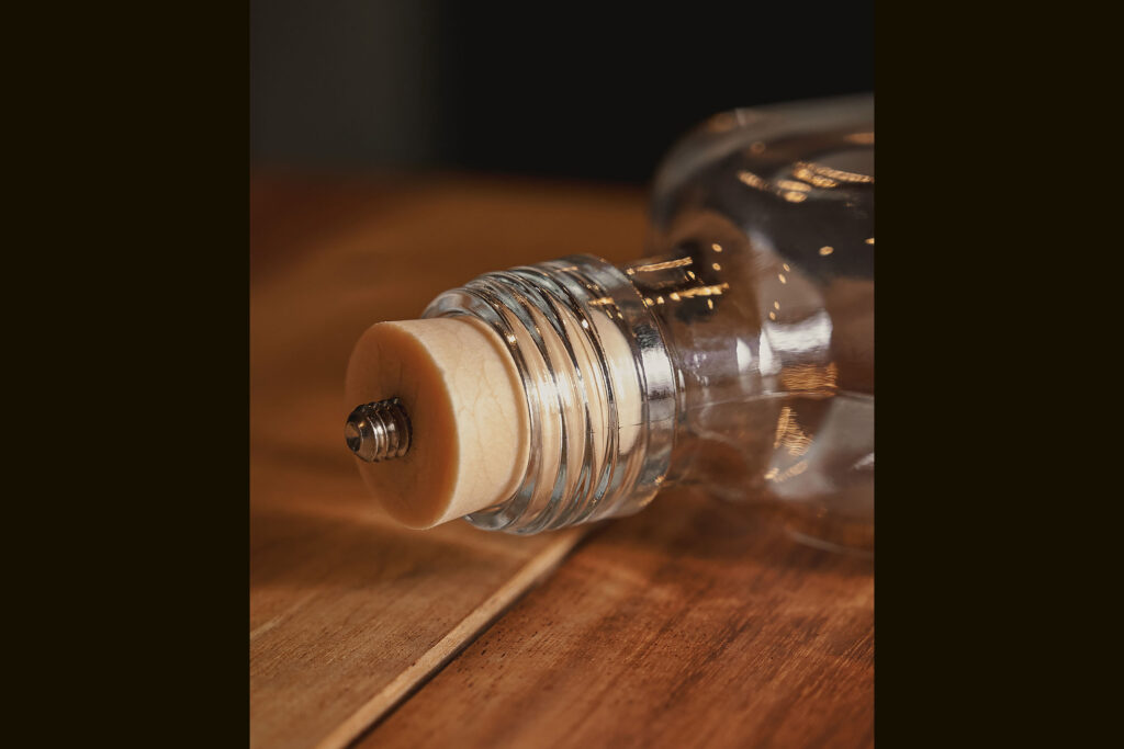 別売りのボトルキャップと組み合わせれば、お好みのガラスボトルにランタンをセットできます。決められた専用スタンドではなく「好きな瓶」を使えるという自由さが、このプロダクトらしい遊び心です。