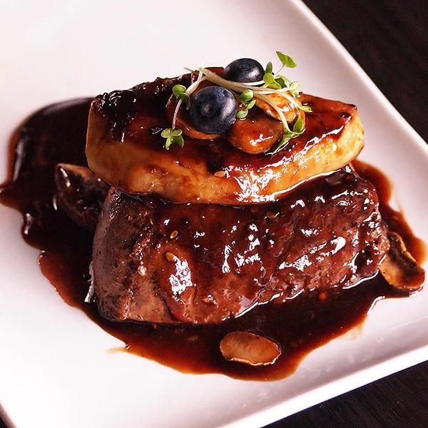 料理の見た目にも味にもこだわる方へ。牛フィレステーキ2枚と、フォアグラ2枚がセットになった「牛フィレのロッシーニ」。